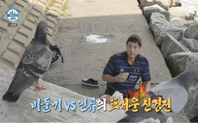 한강에서 운동을 마치고 돗자리를 펴고 햄버거를 먹는 구성환에게 비둘기가 접근하여 웃음을 자아냈습니다. 비둘기를 쫓아보지만 계속해서 맴도는 비둘기들과의 신경전이 재미있었습니다.