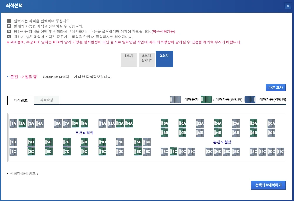 6. 좌석 선택: 조회된 열차 목록에서 원하는 열차와 좌석(전망석 또는 일반석)을 선택합니다.