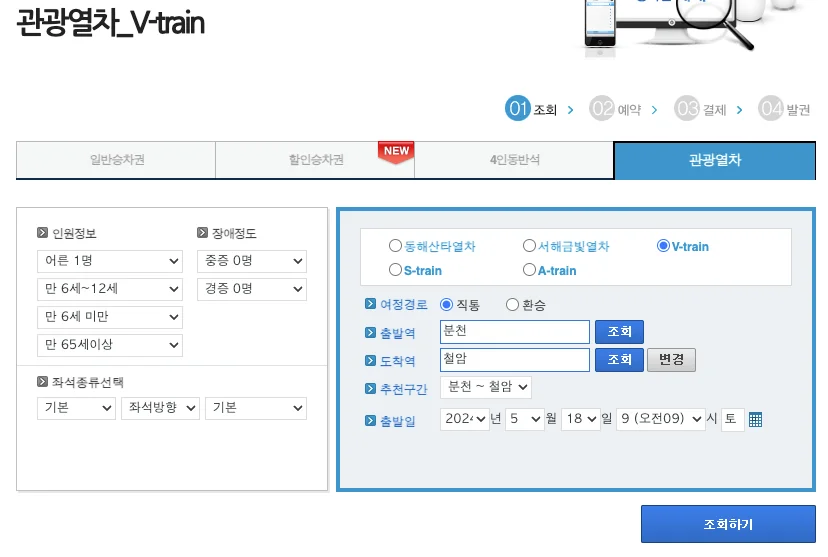 2. 열차 검색 및 선택: ‘관광열차’ 메뉴에서 ‘백두대간 협곡열차’를 검색하고 원하는 노선, 출발일, 시간을 선택합니다.