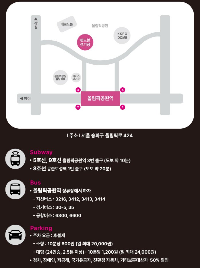 - 지하철 - 5호선 9호선 올림픽공원역 3번 출구 (도보 약 10분) / 8호선 몽촌토성역 1번출구 (도보 약 20분)