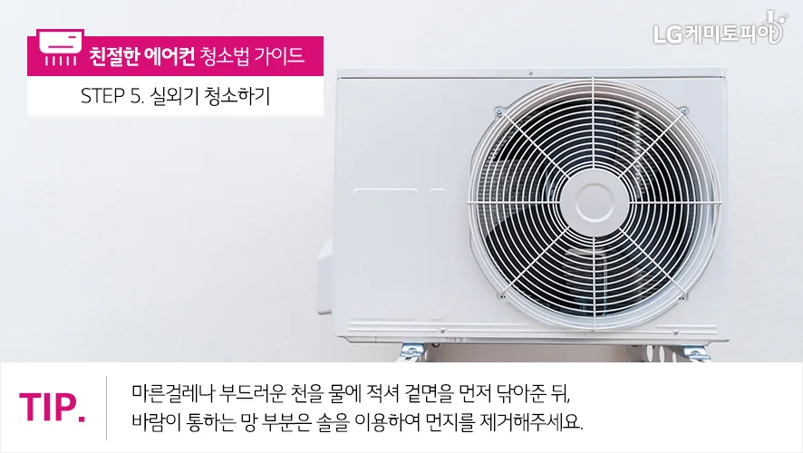 - 실외기의 겉면을 마른걸레로 닦고, 바람이 통하는 부분은 솔로 먼지를 제거합니다.