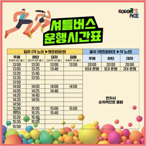 인근 주차장 혼잡이 예상되오니, 컬러레이스 측의 셔틀버스를 적극 이용해 보세요.