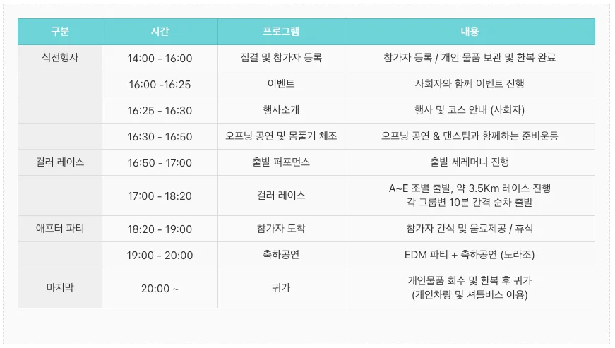 | 17:00 - 18:20 | 컬러 레이스 | A~E 조별 출발, 약 3.5Km 레이스 진행 각 그룹변 10분 간격 순차 출발 |