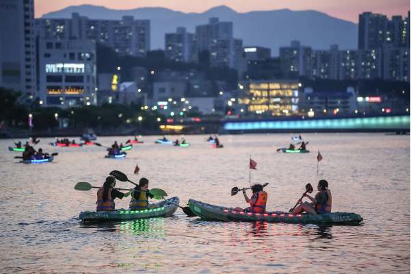 2024년 부산에서 주말마다 바다와 강을 배경으로 한 수영강에서 LED카약 체험이 열렸습니다.